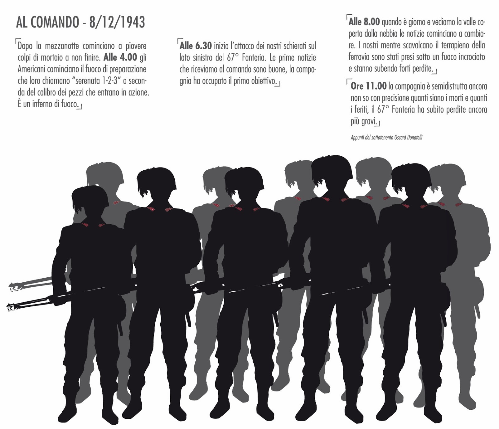 Ai lati, sotto il racconto delle ore di quella battaglia, ci sono loro, i caduti, posti in piedi, su 20 figure nere, senza volto, i cui unici caratteri di identificazione sono le mostrine rosse dei Bersaglieri, l’elmetto piumato e la loro mostrina.